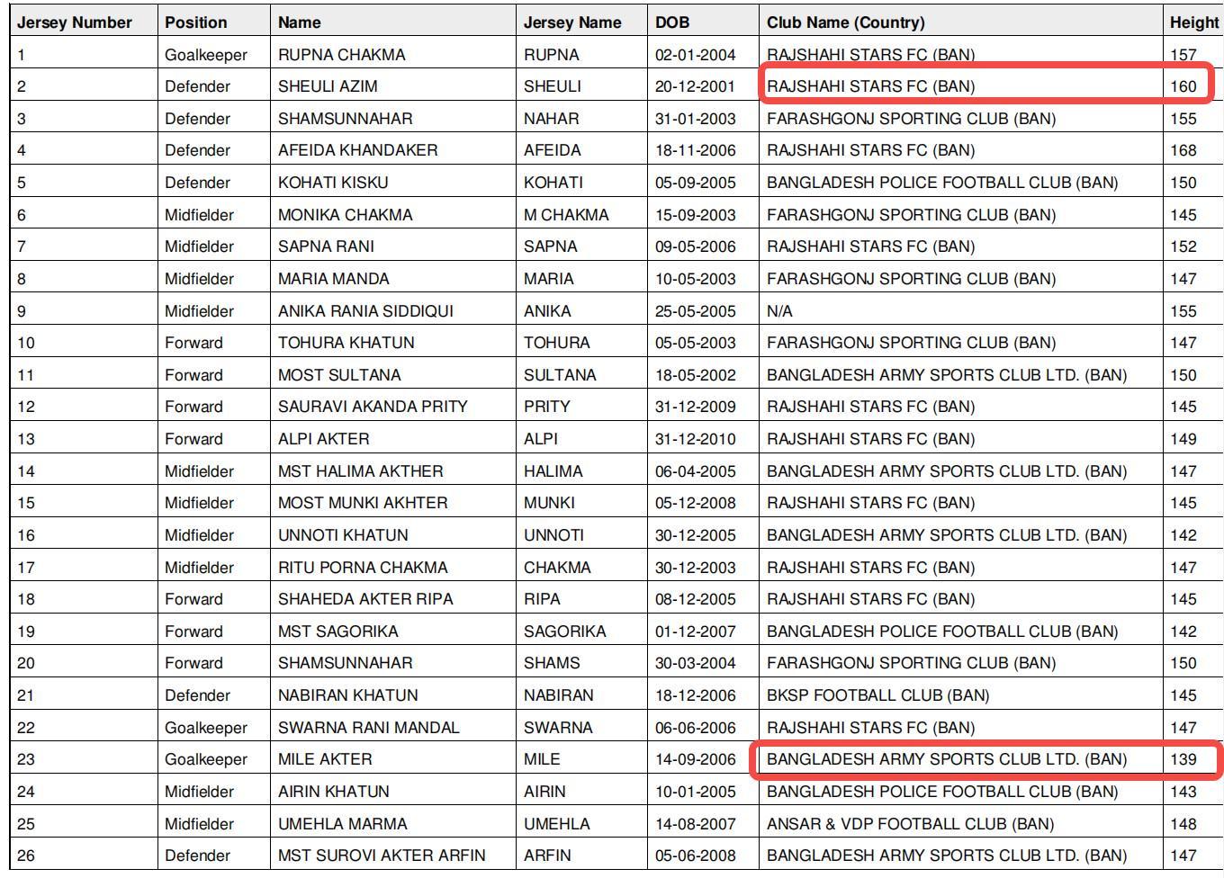 甚至亚足联自己本身的数据也难以自圆其说。根据比赛画面显示,例如这一场景中,孟加拉国2号球员在亚足联官方数据中身高为160cm,而图中显示孟加拉女足门将与2号球员身高并无太大差距甚至还略高一些,但在亚足联官方数据里阿克特身高仅有139cm。